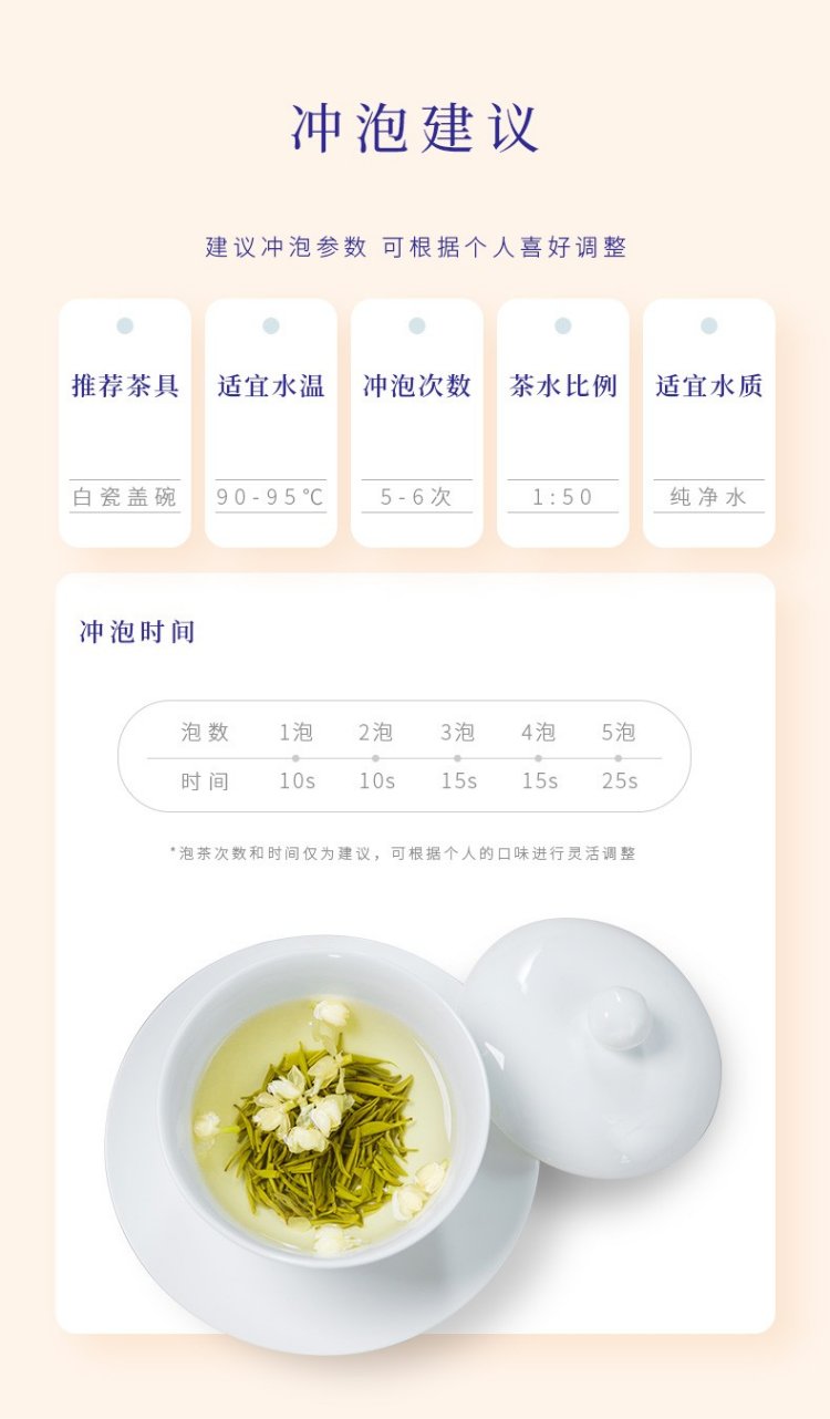 茶具选择玻璃杯、瓷杯为佳,茶水比1:50,水温90~100℃,茶水饮至1/3处即可续水,一般冲泡三次。