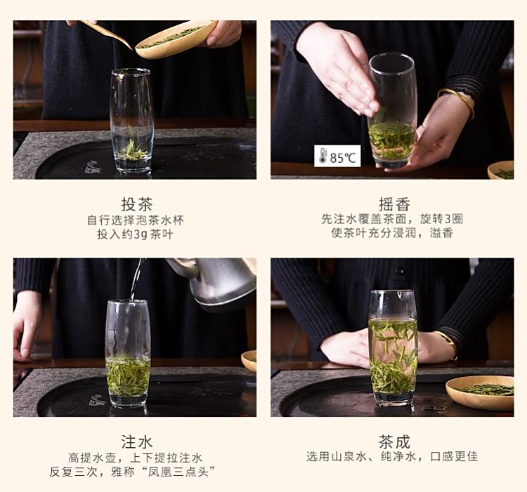 茶具选择玻璃杯为佳,茶水比1:50,水温85~90℃,茶水饮至1/3处即可续水,一般冲泡三次。