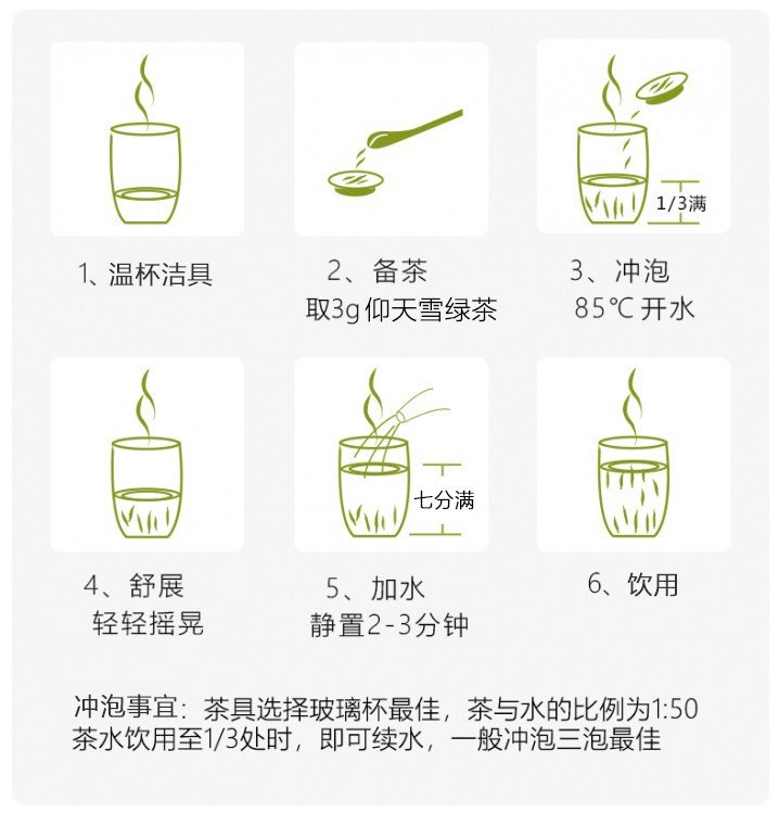 茶具选择玻璃杯为佳,茶水比1:50,水温85~90℃,茶水饮至1/3处即可续水,一般冲泡三次。