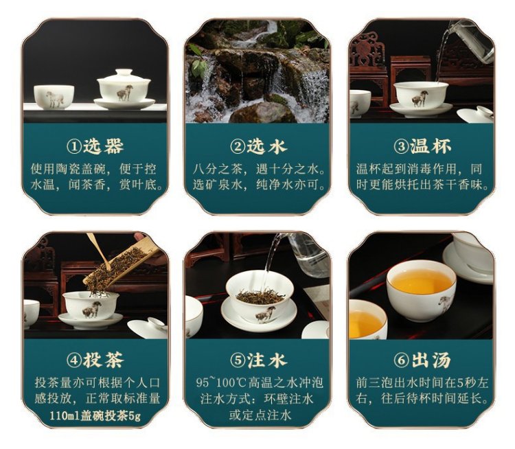 茶具选择白瓷盖碗为佳,茶水比1:20,水温95~100℃,注水后5s出汤,可冲泡5~7次。