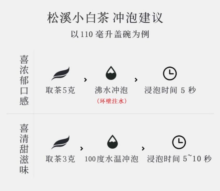 茶具选择白瓷盖碗为佳,茶水比1:20,水温100℃,润茶、注水后5s出汤,可冲泡10余次。