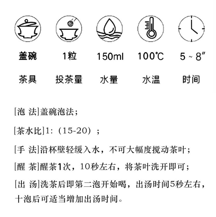 茶具选择玻璃杯为佳,茶水比1:18,水温100℃,润茶、注水后10s出汤,可冲泡10余次。