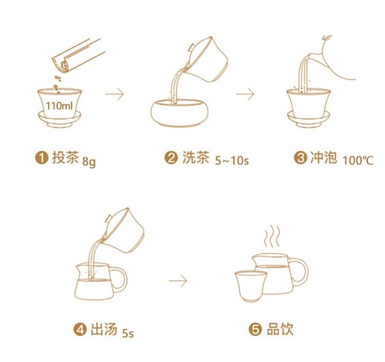 茶具选择玻璃杯为佳,茶水比1:18,水温100℃,润茶、注水后10s出汤,可冲泡10余次。