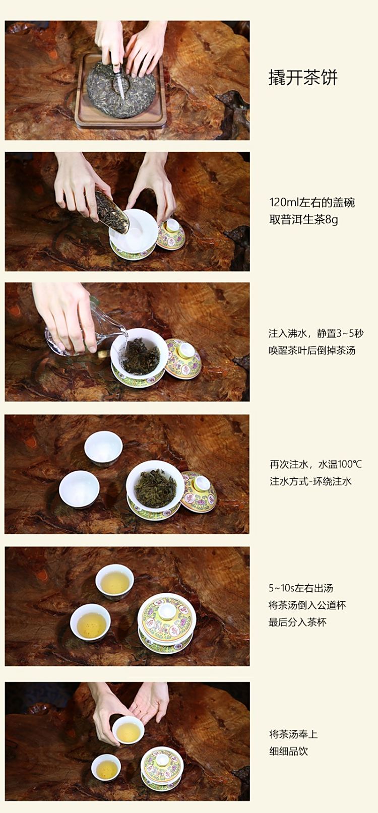 茶具选择玻璃杯为佳,茶水比1:18,水温100℃,润茶、注水后10s出汤,可冲泡10余次。