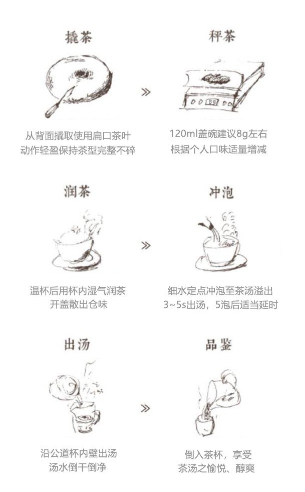 茶具选择玻璃杯为佳,茶水比1:18,水温100℃,润茶、注水后10s出汤,可冲泡10余次。