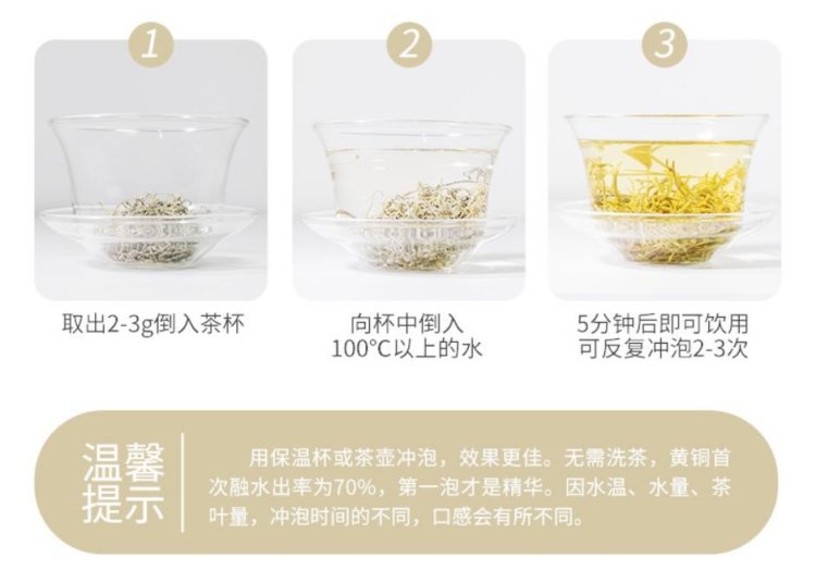 茶具选择玻璃杯、瓷杯为佳,茶水比1:50,水温90~100℃,茶水饮至1/3处即可续水,一般冲泡三次。