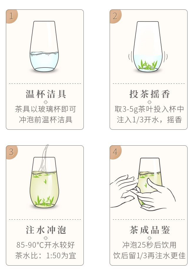 茶具选择玻璃杯为佳,茶水比1:50,水温85~90℃,茶水饮至1/3处即可续水,一般冲泡三次。