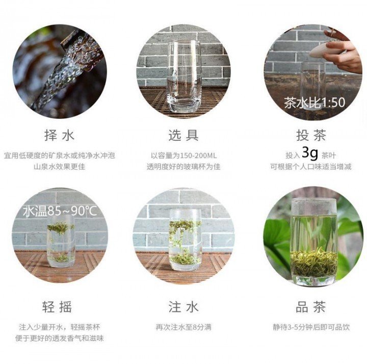 茶具选择玻璃杯为佳,茶水比1:50,水温85~90℃,茶水饮至1/3处即可续水,一般冲泡三次。
