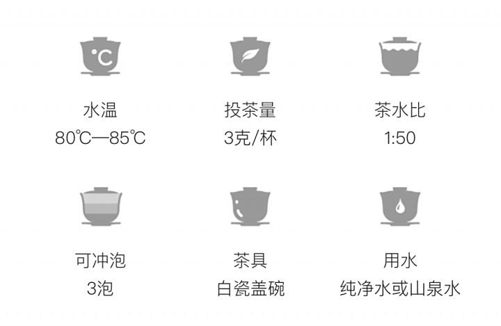 茶具选择玻璃杯为佳,茶水比1:50,水温85~90℃,茶水饮至1/3处即可续水,一般冲泡三次。