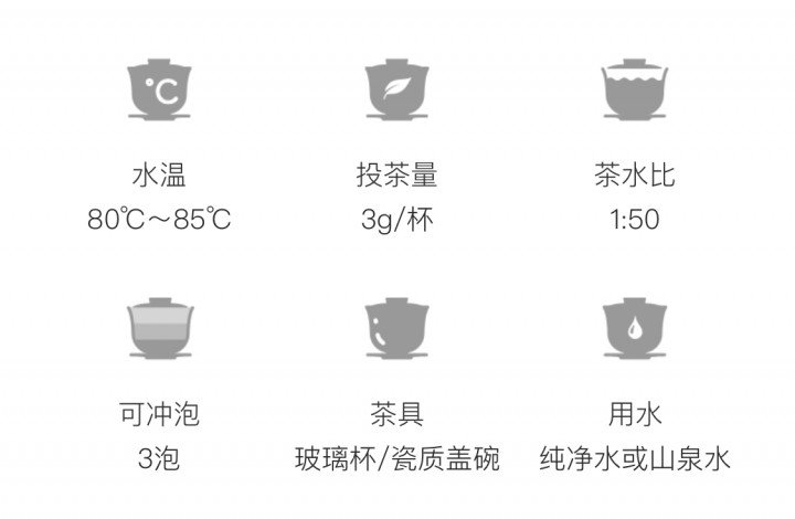 茶具选择玻璃杯为佳,茶水比1:50,水温85~90℃,茶水饮至1/3处即可续水,一般冲泡三次。
