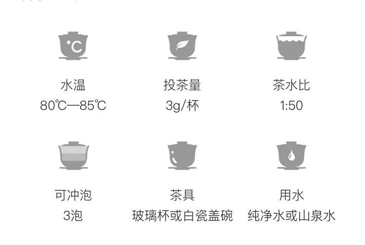 茶具选择玻璃杯为佳,茶水比1:50,水温85~90℃,茶水饮至1/3处即可续水,一般冲泡三次。