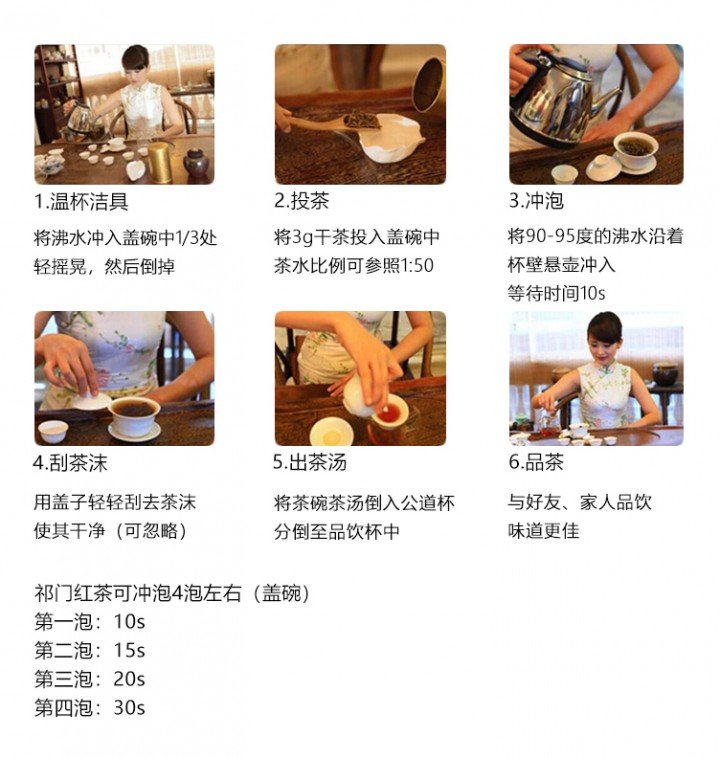茶具选择白瓷盖碗为佳,茶水比1:20,水温95~100℃,注水后5s出汤,可冲泡5~7次。
