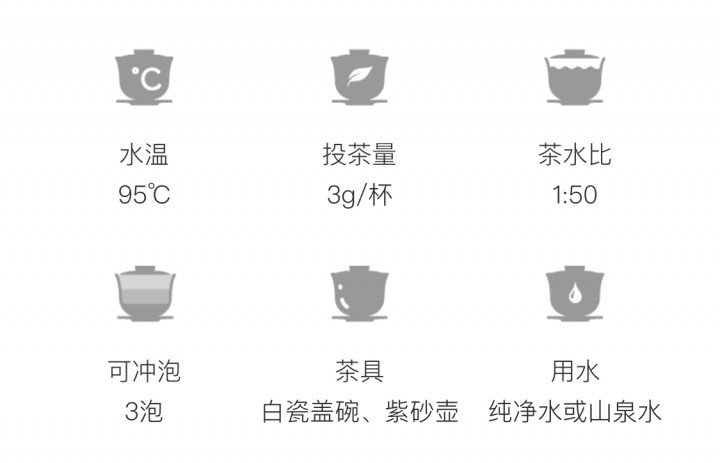茶具选择白瓷盖碗为佳,茶水比1:20,水温95~100℃,注水后5s出汤,可冲泡5~7次。