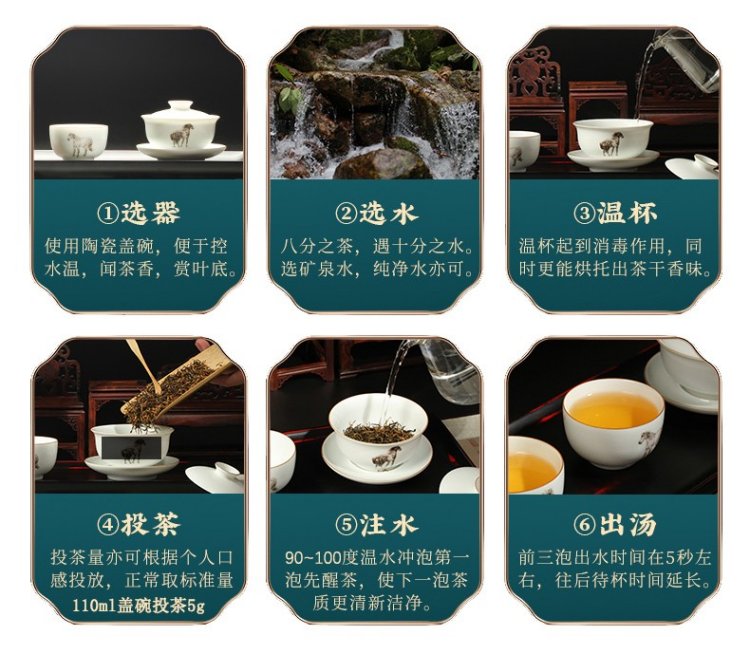 茶具选择白瓷盖碗为佳,茶水比1:20,水温95~100℃,注水后5s出汤,可冲泡5~7次。