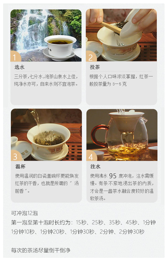 茶具选择白瓷盖碗为佳,茶水比1:20,水温95~100℃,注水后5s出汤,可冲泡5~7次。
