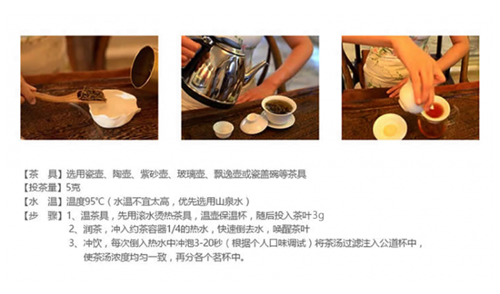 茶具选择白瓷盖碗为佳,茶水比1:20,水温95~100℃,注水后5s出汤,可冲泡5~7次。