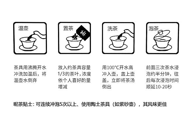 茶具选择白瓷盖碗、紫砂壶为佳,茶水比1:15,水温100℃,润茶、注水后20s出汤,可冲泡7余次。