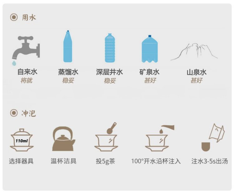 茶具选择白瓷盖碗为佳,茶水比1:20,水温100℃,润茶、注水后5s出汤,可冲泡10余次。